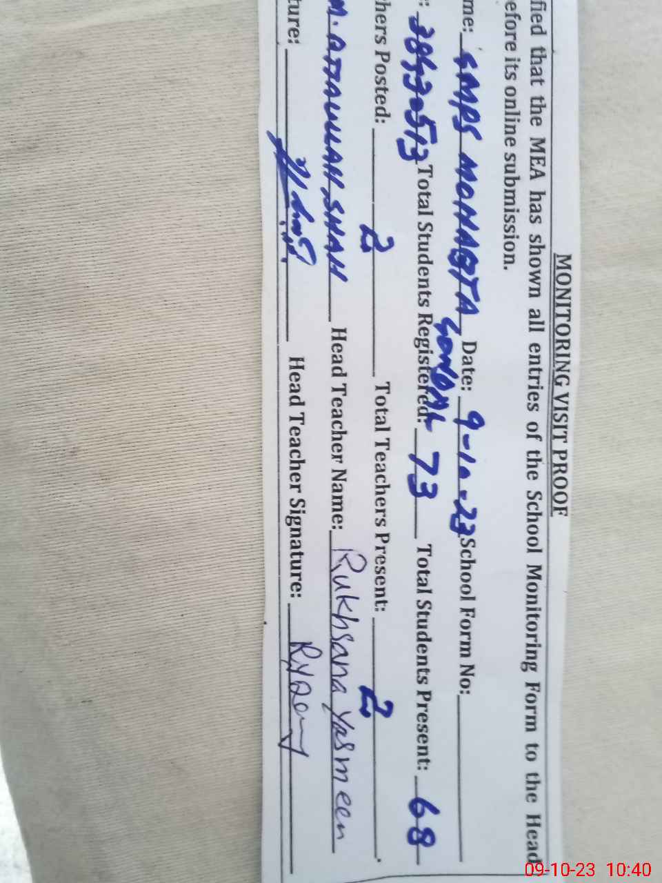| Certified that this School was Inspected by the Undersigned MEA/DMO Today and the Information Stated Above is as Per Record. | |||||
