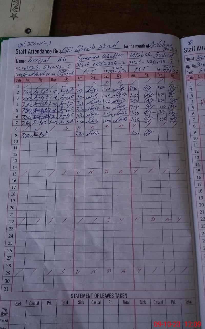 | CNIC | Full Name | Designation | R/C | Absence During Last Calender Month |