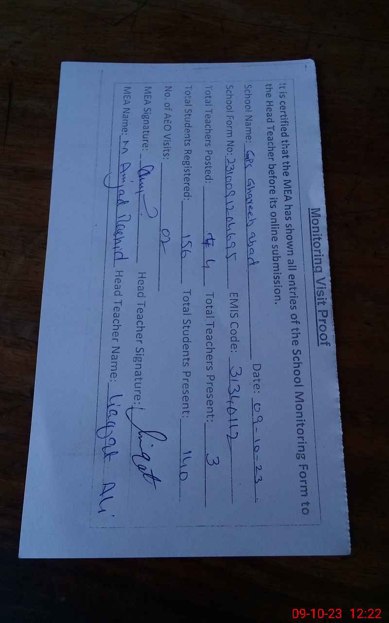 | Certified that this School was Inspected by the Undersigned MEA/DMO Today and the Information Stated Above is as Per Record. | |||||