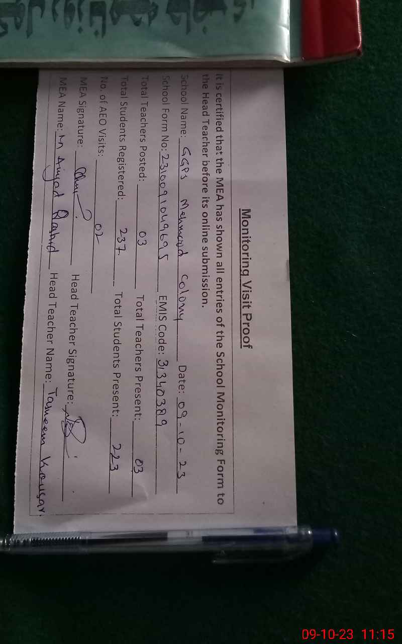 | EMIS Code: 31340389 | Name of School: GGPS MAHMOOD COLONY MUSTAFA TOWN | |||