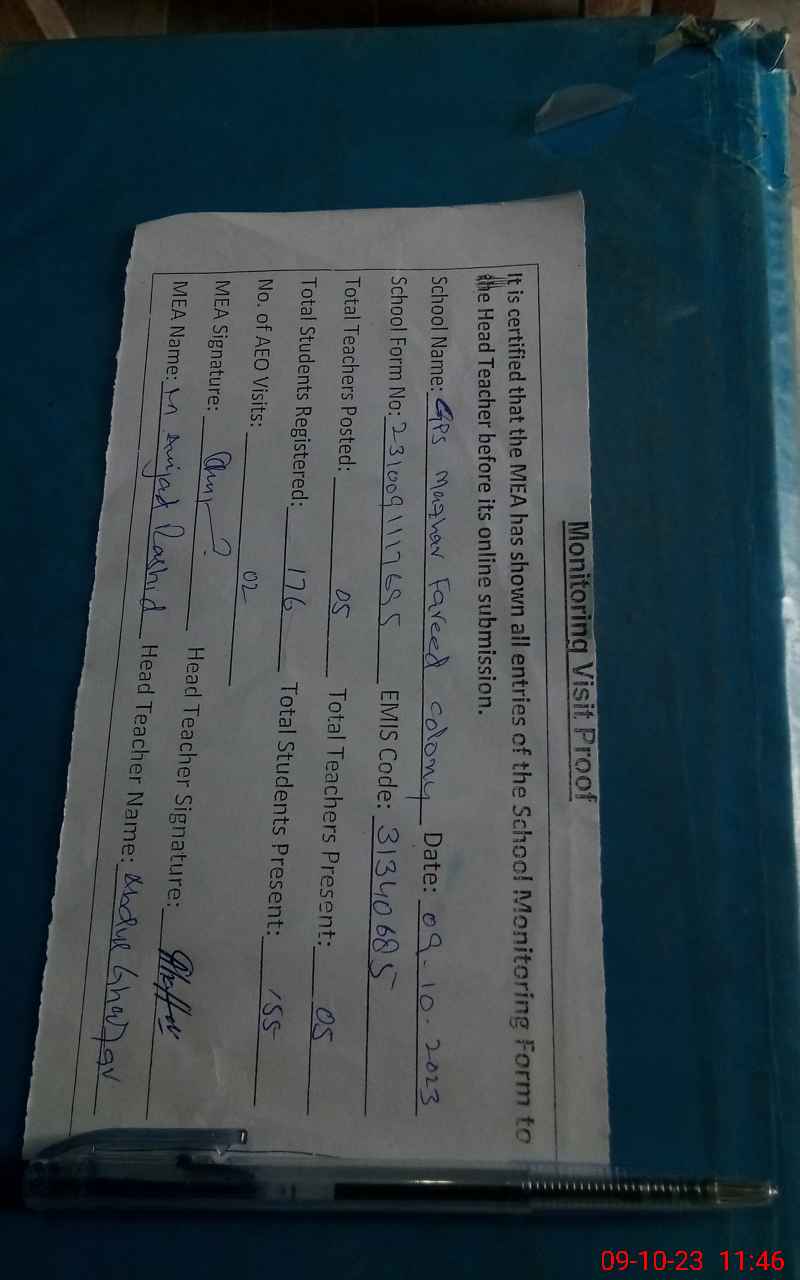| EMIS Code: 31340685 | Name of School: GPS MAZHAR FARID COLONY | |||