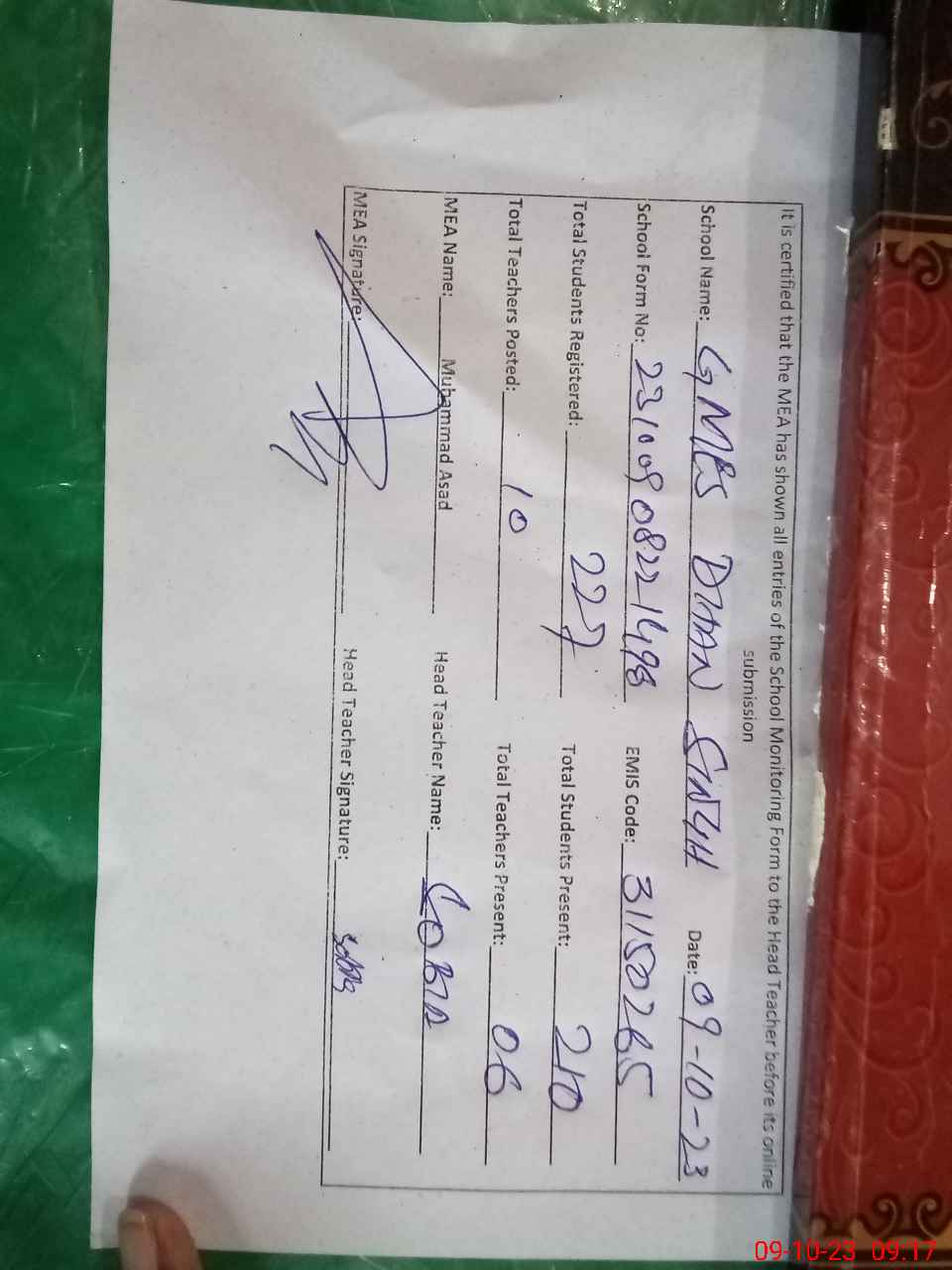 | Attendance Register | Head Teacher | MEA with School | Visit Proof |