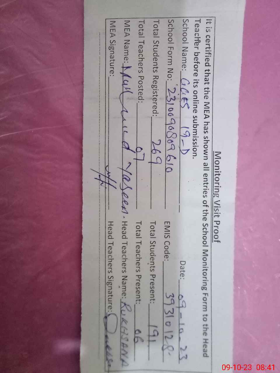 | Certified that this School was Inspected by the Undersigned MEA/DMO Today and the Information Stated Above is as Per Record. | |||||