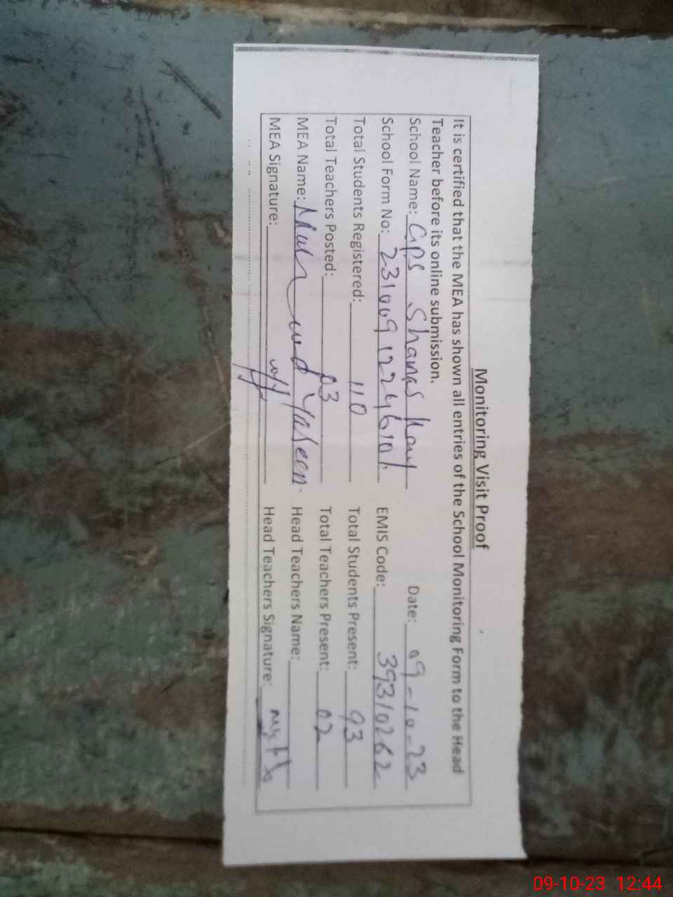 | Attendance Register | Head Teacher | MEA with School | Visit Proof |