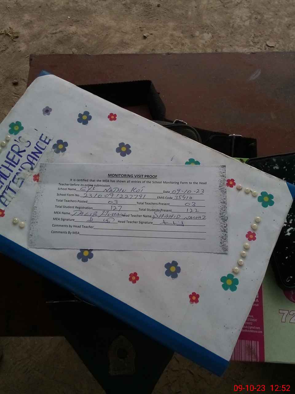 | Attendance Register | Head Teacher | MEA with School | Visit Proof |