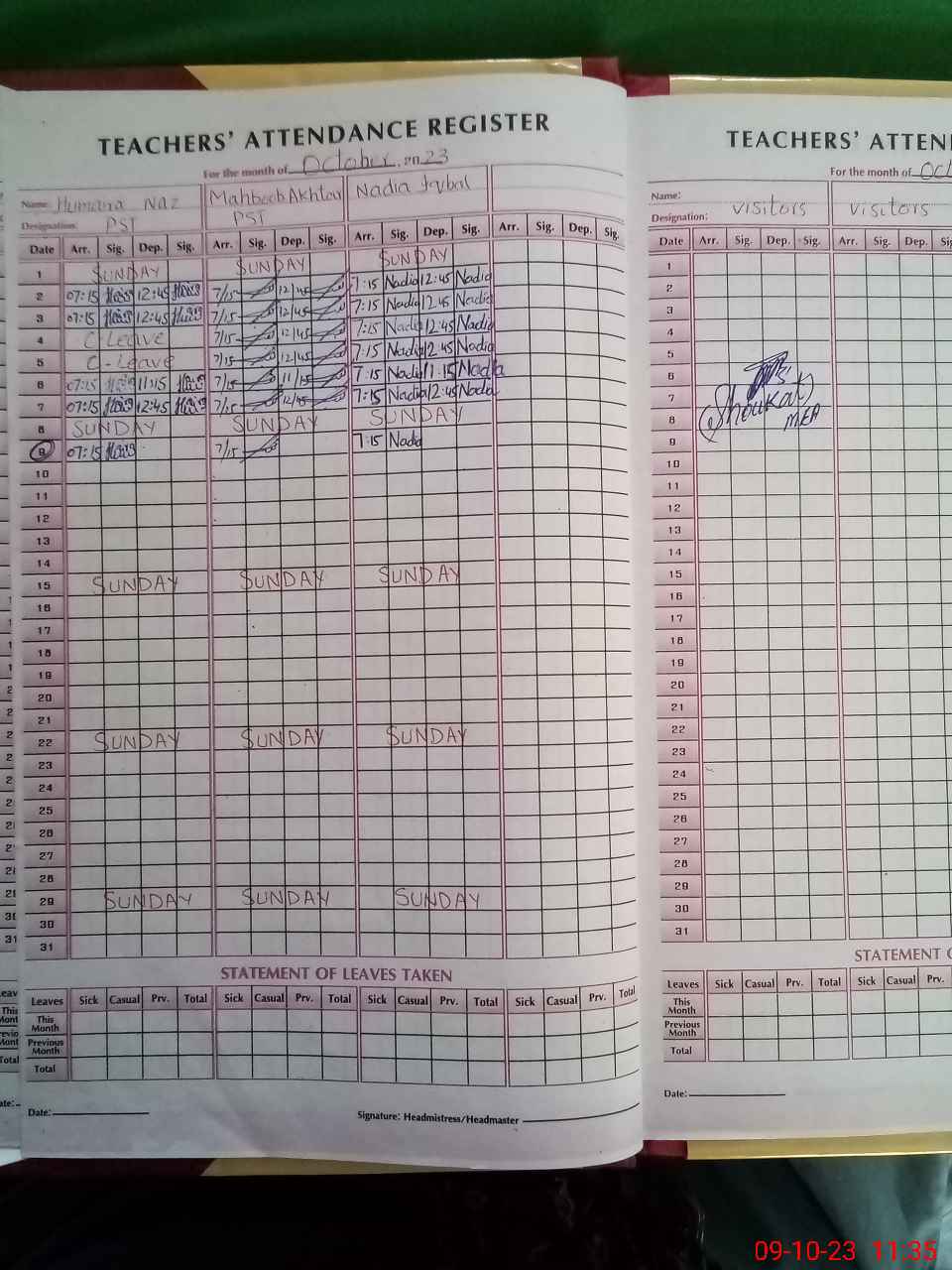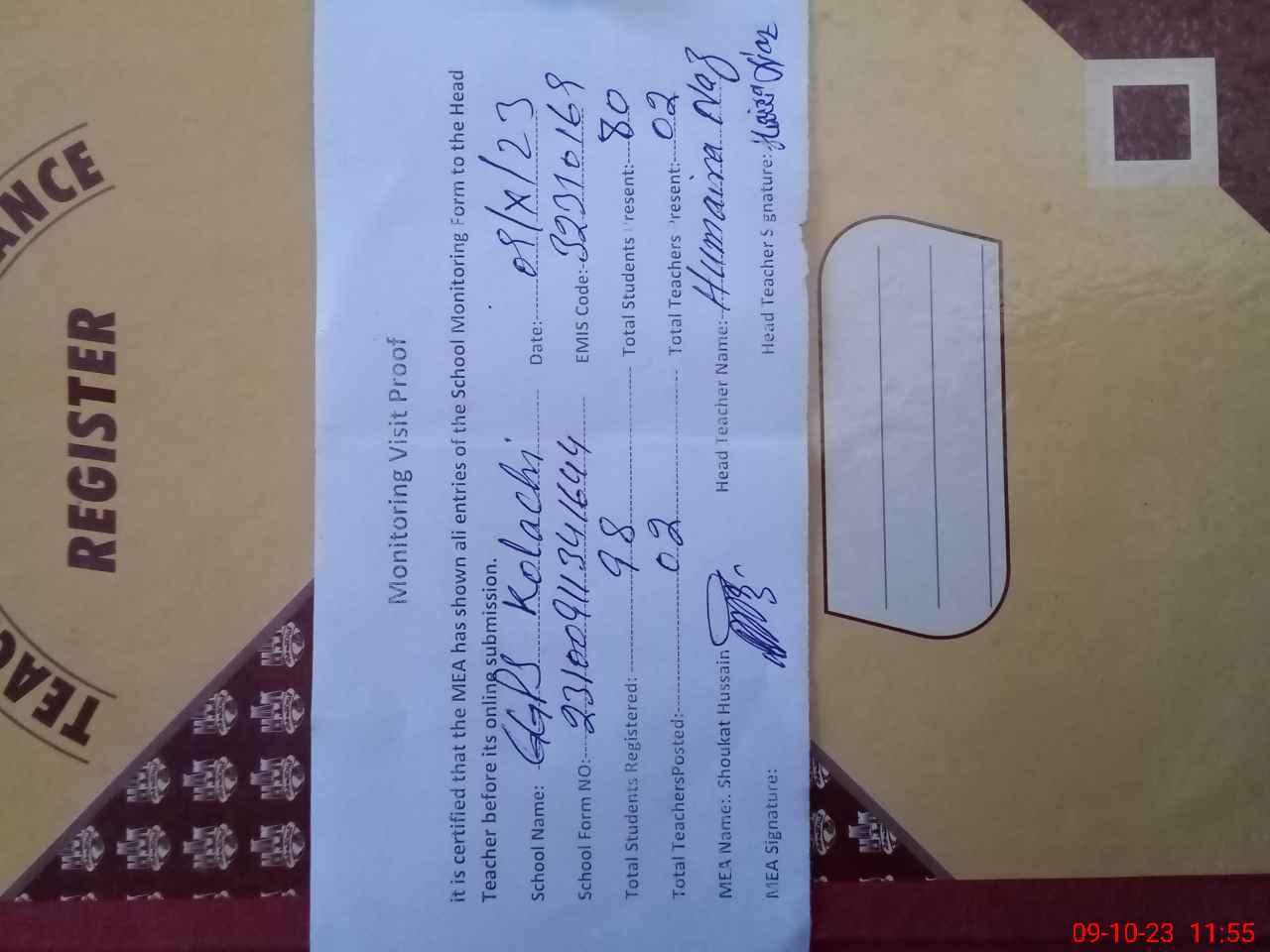 | Attendance Register | Head Teacher | MEA with School | Visit Proof |