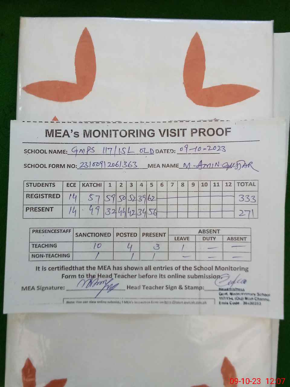 | Attendance Register | Head Teacher | MEA with School | Visit Proof |