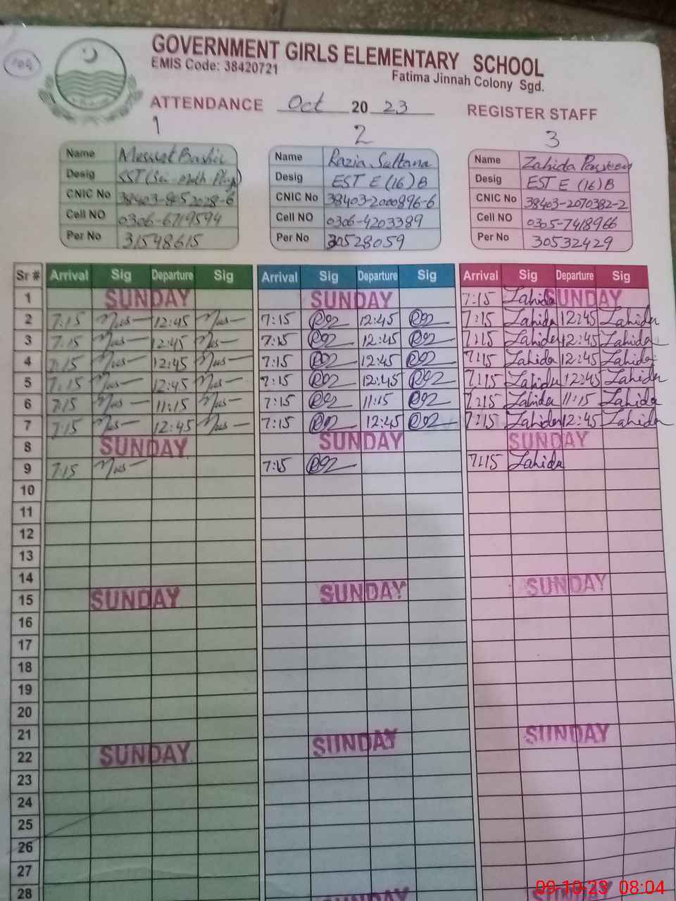| CNIC | Full Name | Designation | R/C | Absence during last cal. month |