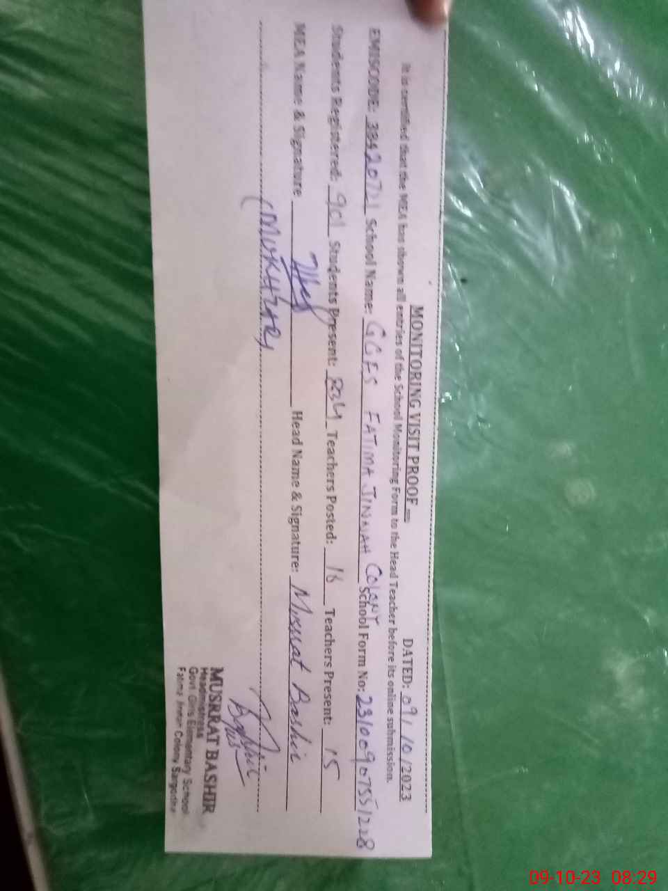 | Certified that this School was Inspected by the Undersigned MEA/DMO Today and the Information Stated Above is as Per Record. | |||||