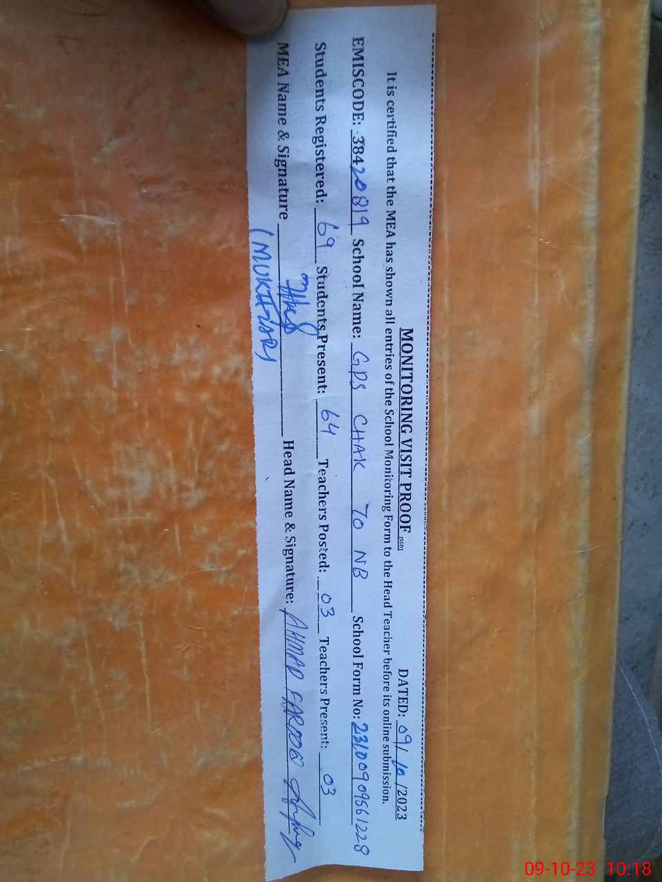 | Attendance Register | Head Teacher | MEA with School | Visit Proof |