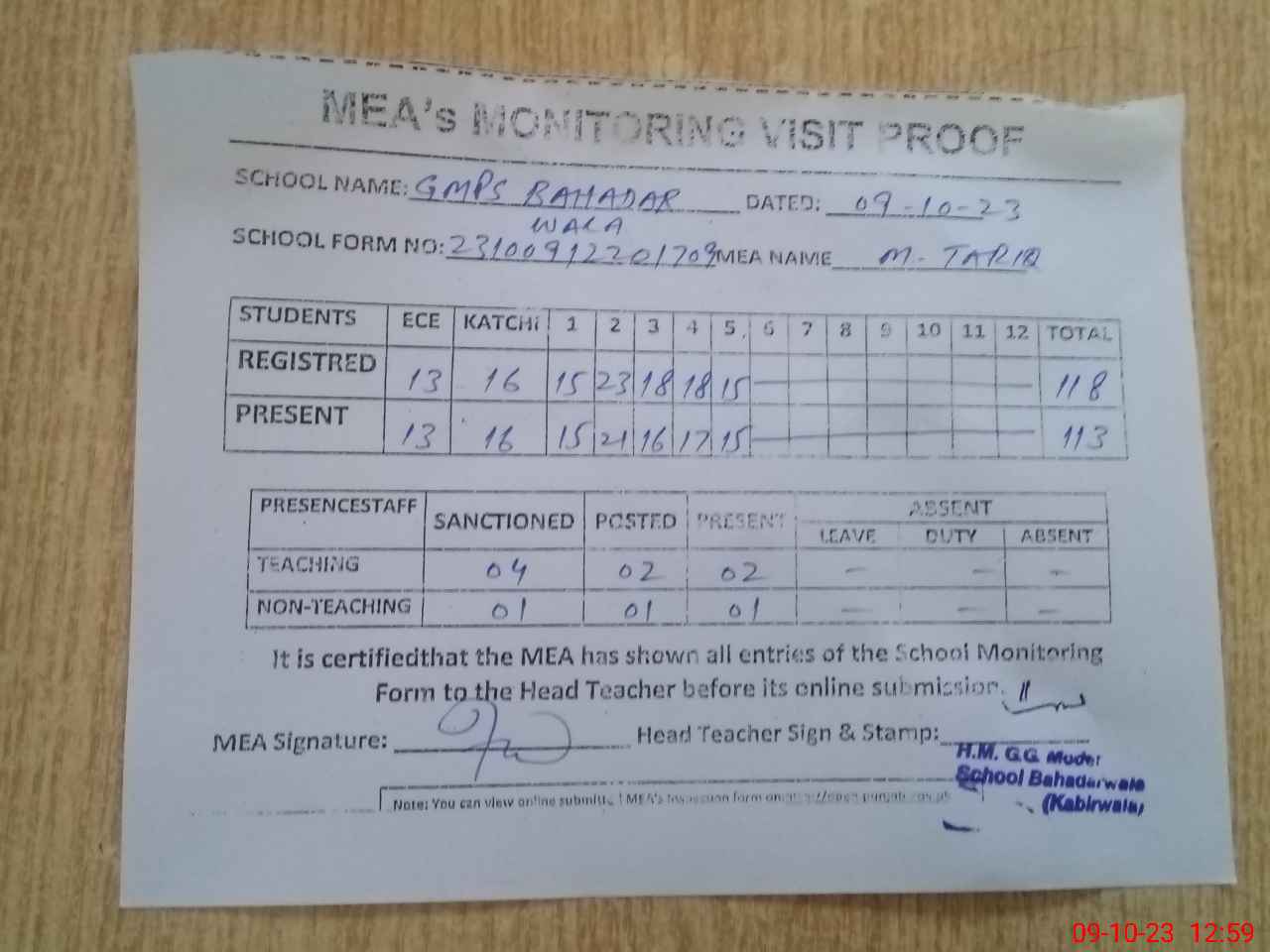 | Attendance Register | Head Teacher | MEA with School | Visit Proof |