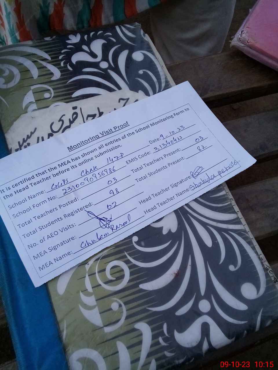 | Attendance Register | Head Teacher | MEA with School | Visit Proof |