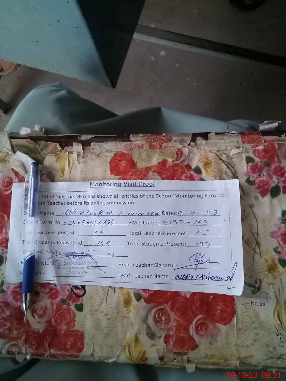 | Attendance Register | Head Teacher | MEA with School | Visit Proof |
