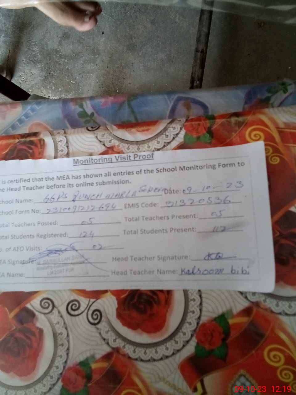 | Monitoring Date: 09-10-2023 | Start Time: 09-10-2023 12:02 PM | End Time: 09-10-2023 12:20 PM | Name of MEA: Mu**** Sa**** Ul**** Sa**** | |