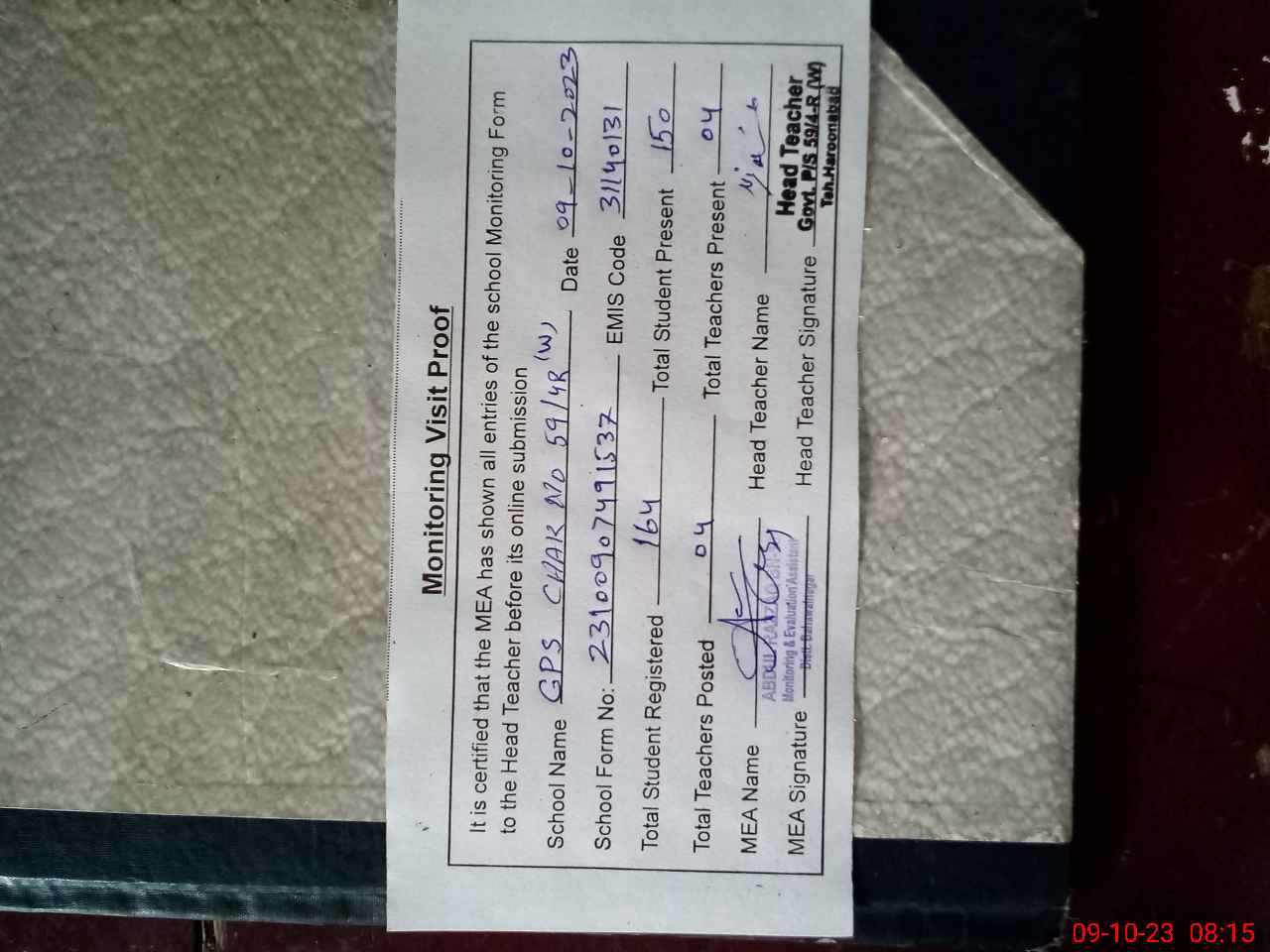 | Attendance Register | Head Teacher | MEA with School | Visit Proof |