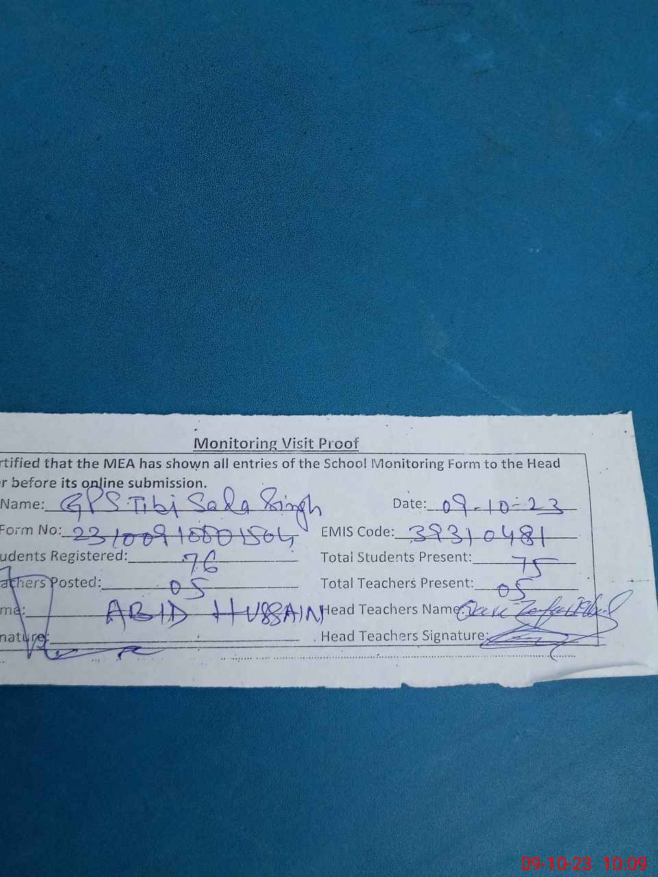 | Attendance Register | Head Teacher | MEA with School | Visit Proof |