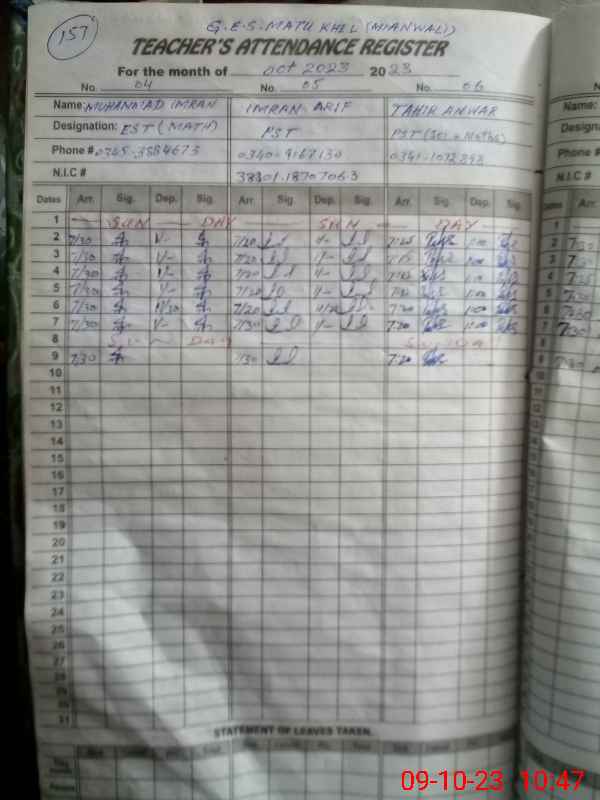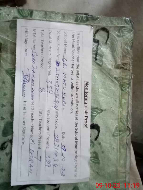 | Total no. of Classrooms: 10 No. of Classrooms Used for Teaching: 9 No. of Classrooms Storing Old Furniture, FTBs, etc: 0Comments if Any: EST M Irshad was absent her leave record was not shown to MEA during visit second Head M Imran refused to visit prooof |