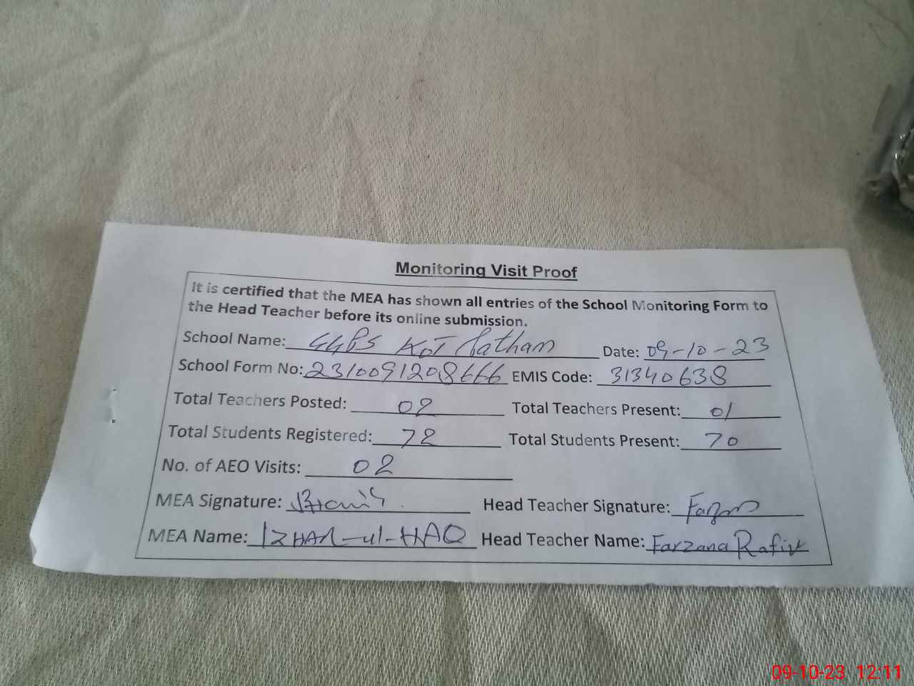 | Monitoring Date: 09-10-2023 | Start Time: 09-10-2023 11:35 AM | End Time: 09-10-2023 12:12 PM | Name of MEA: Mu**** Iz**** UlHa**** | |