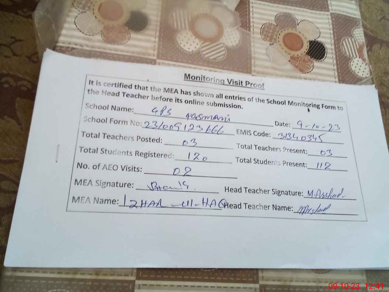 | Attendance Register | Head Teacher | MEA with School | Visit Proof |