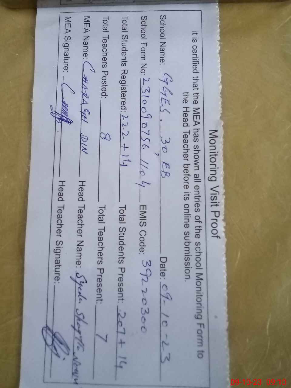 | Attendance Register | Head Teacher | MEA with School | Visit Proof |