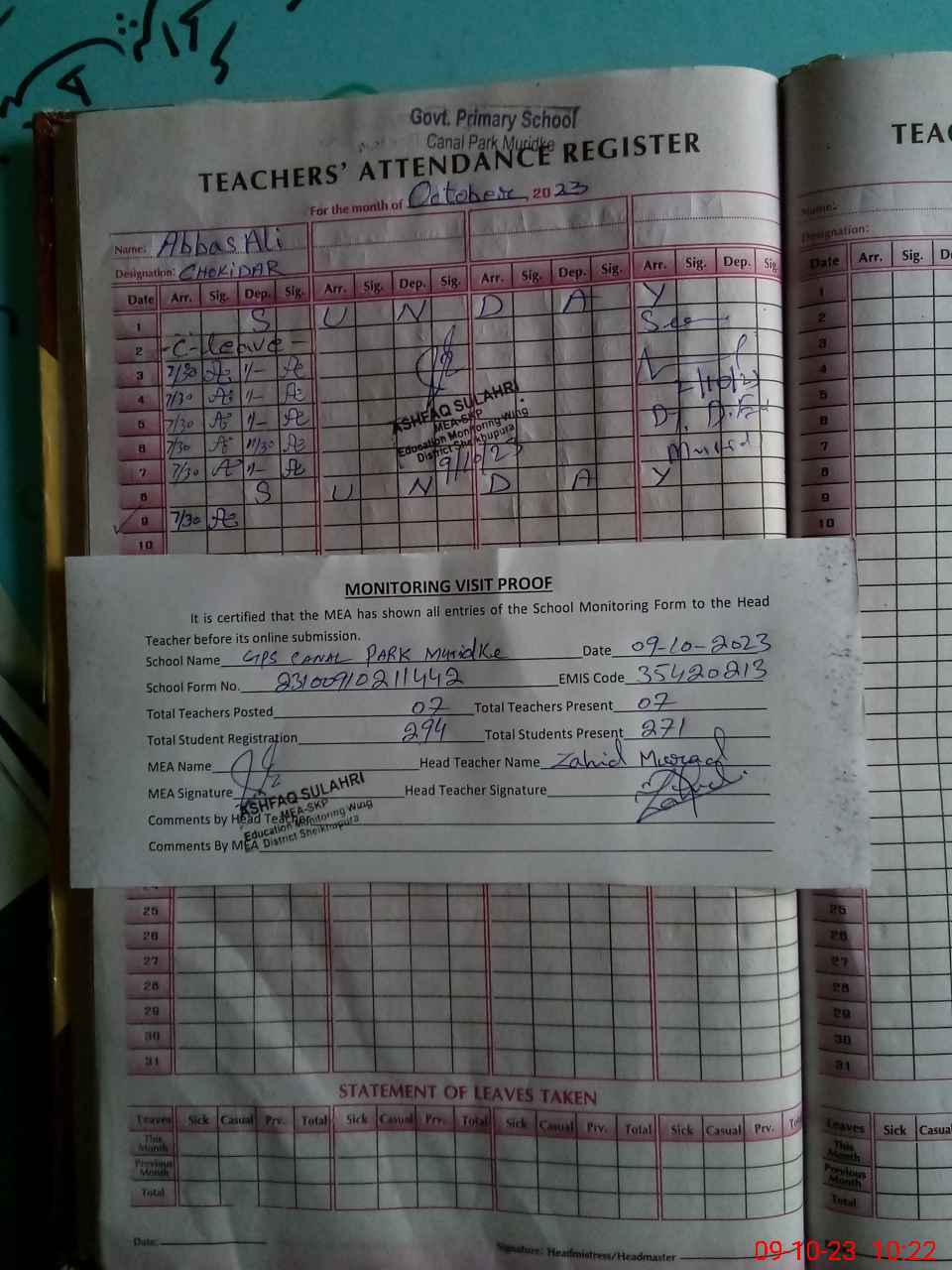 | Attendance Register | Head Teacher | MEA with School | Visit Proof |