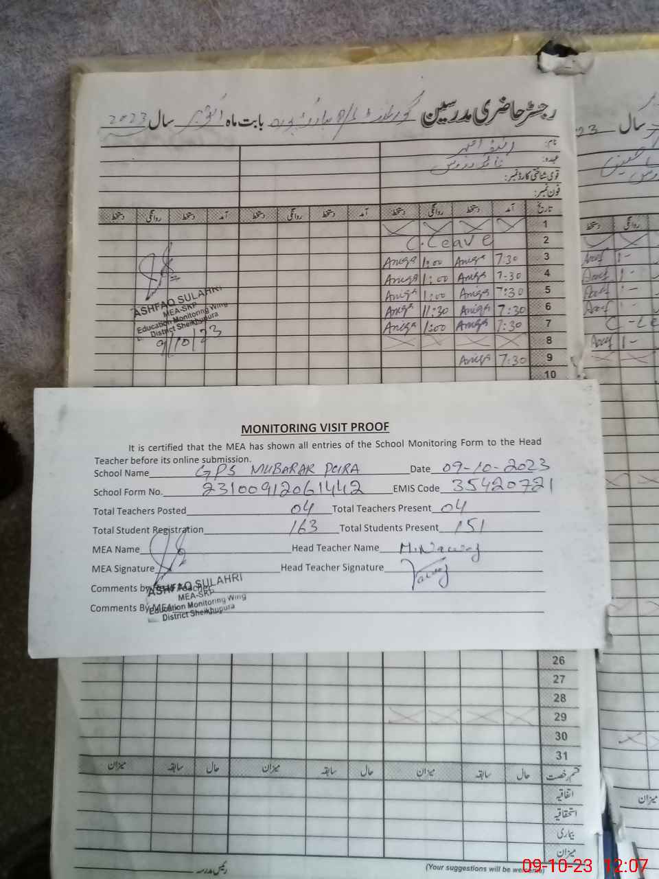 | Attendance Register | Head Teacher | MEA with School | Visit Proof |
