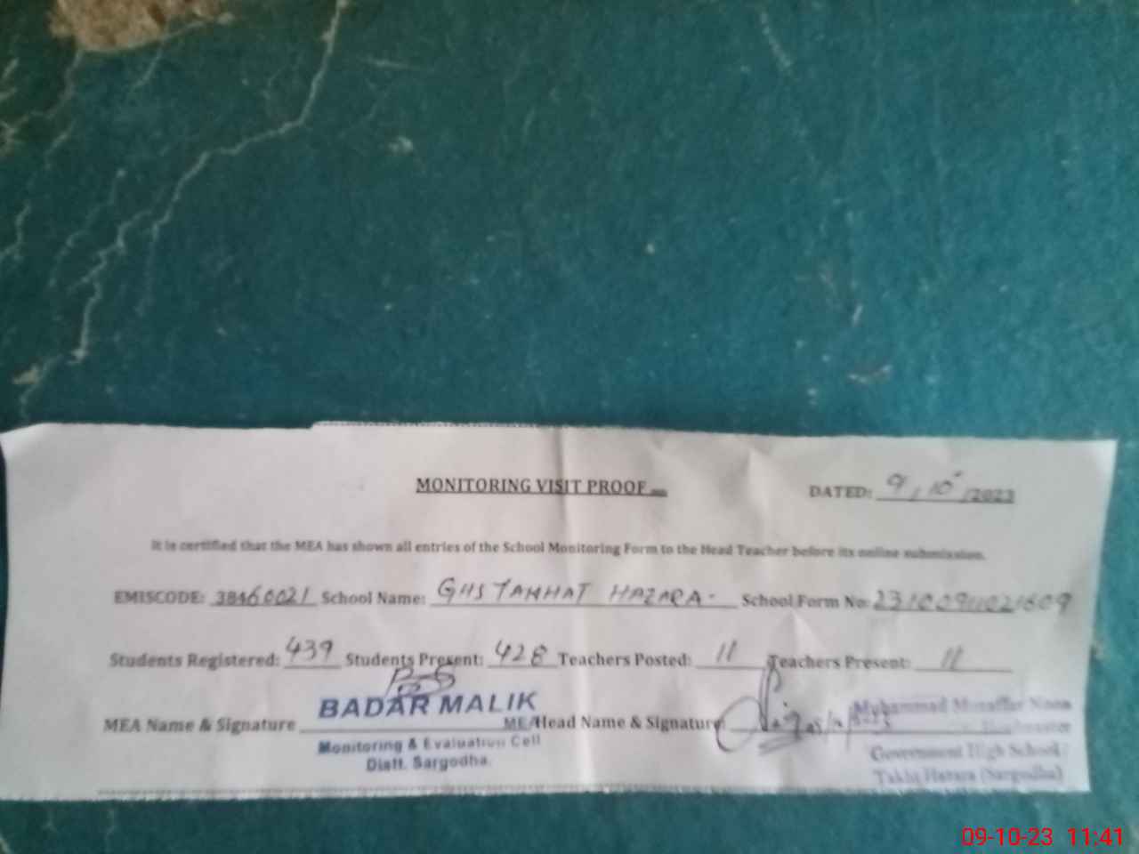 | EMIS Code: 38460021 | Name of School: GHS TAKHAT HAZARA | |||