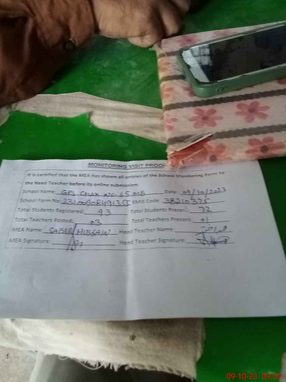 | Monitoring Date: 09-10-2023 | Start Time: 09-10-2023 08:35 AM | End Time: 09-10-2023 09:01 AM | Name of MEA: SA**** HU**** | |