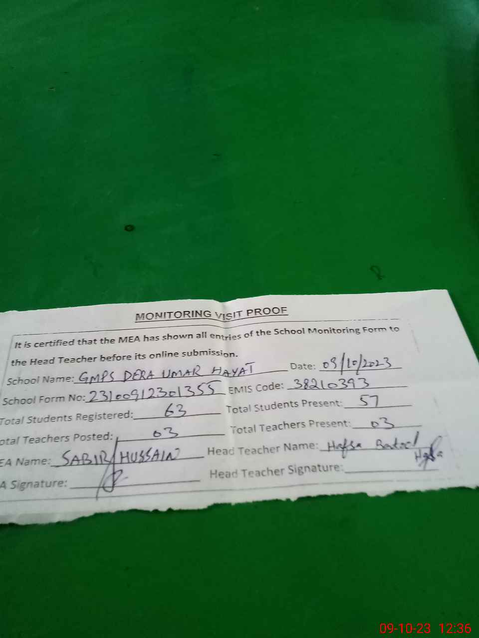 | Attendance Register | Head Teacher | MEA with School | Visit Proof |