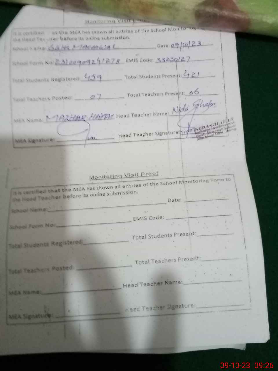 | Attendance Register | Head Teacher | MEA with School | Visit Proof |