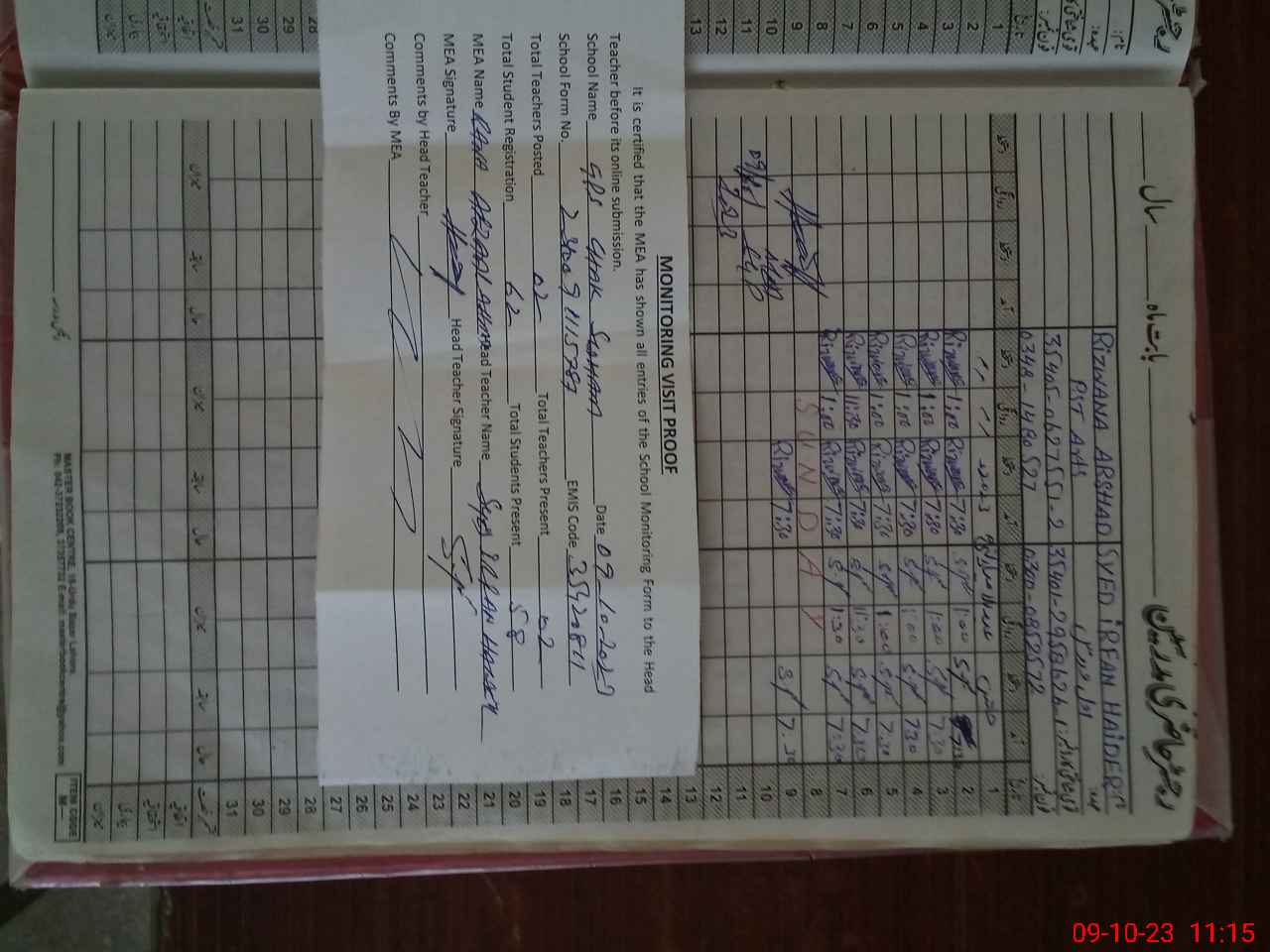 | Attendance Register | Head Teacher | MEA with School | Visit Proof |