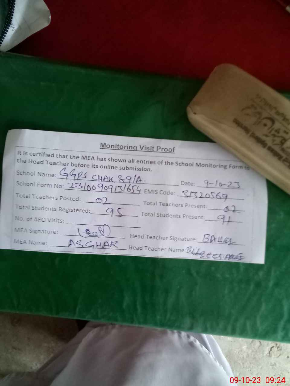 | Attendance Register | Head Teacher | MEA with School | Visit Proof |