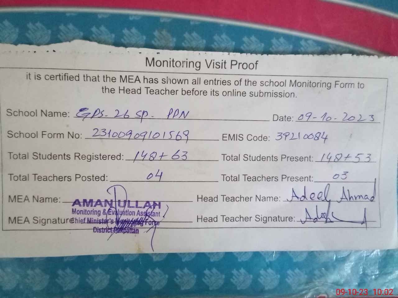 | EMIS Code: 39210084 | Name of School: GPS 26/SP PAKPATTAN | |||