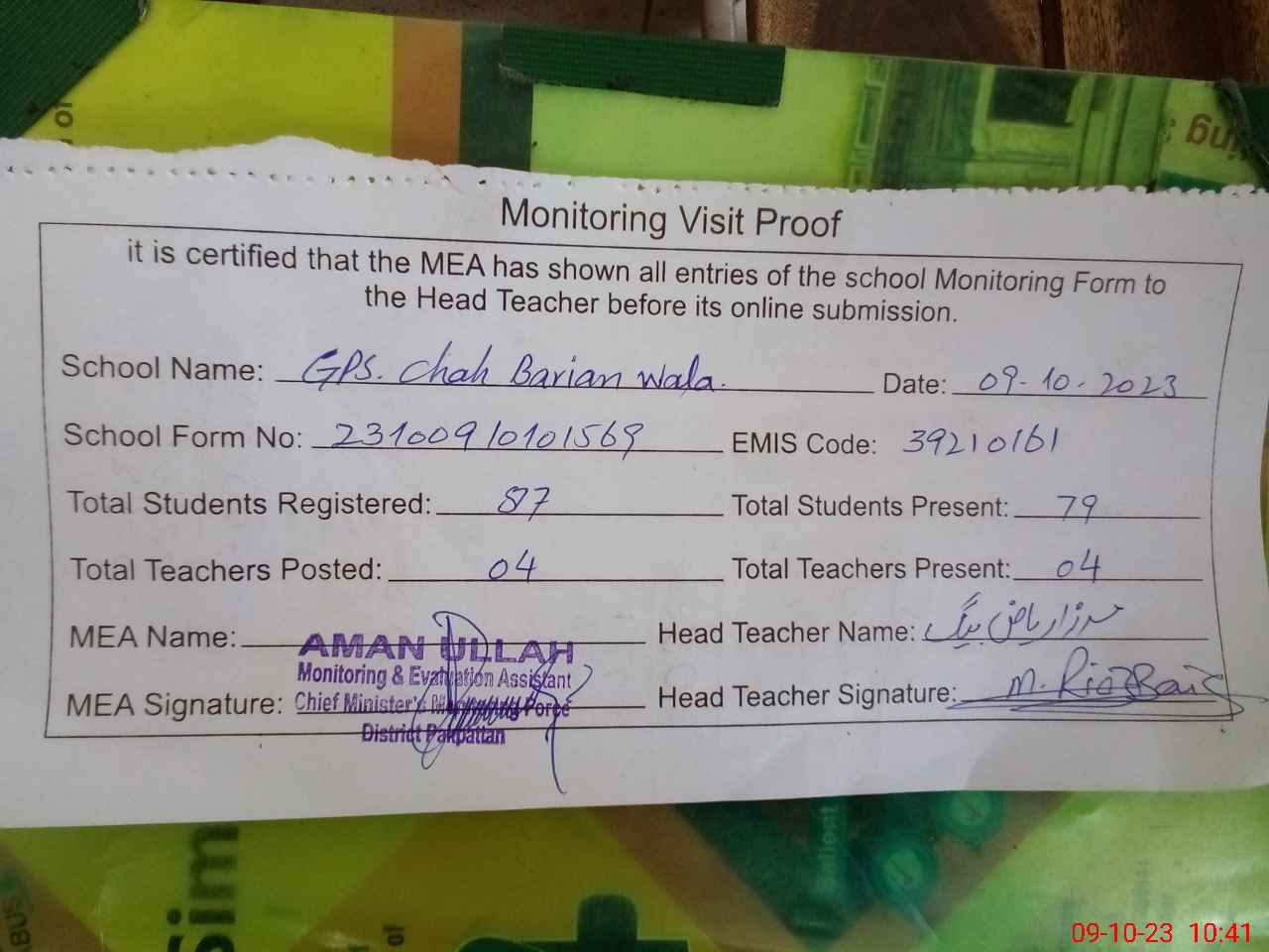 | Attendance Register | Head Teacher | MEA with School | Visit Proof |