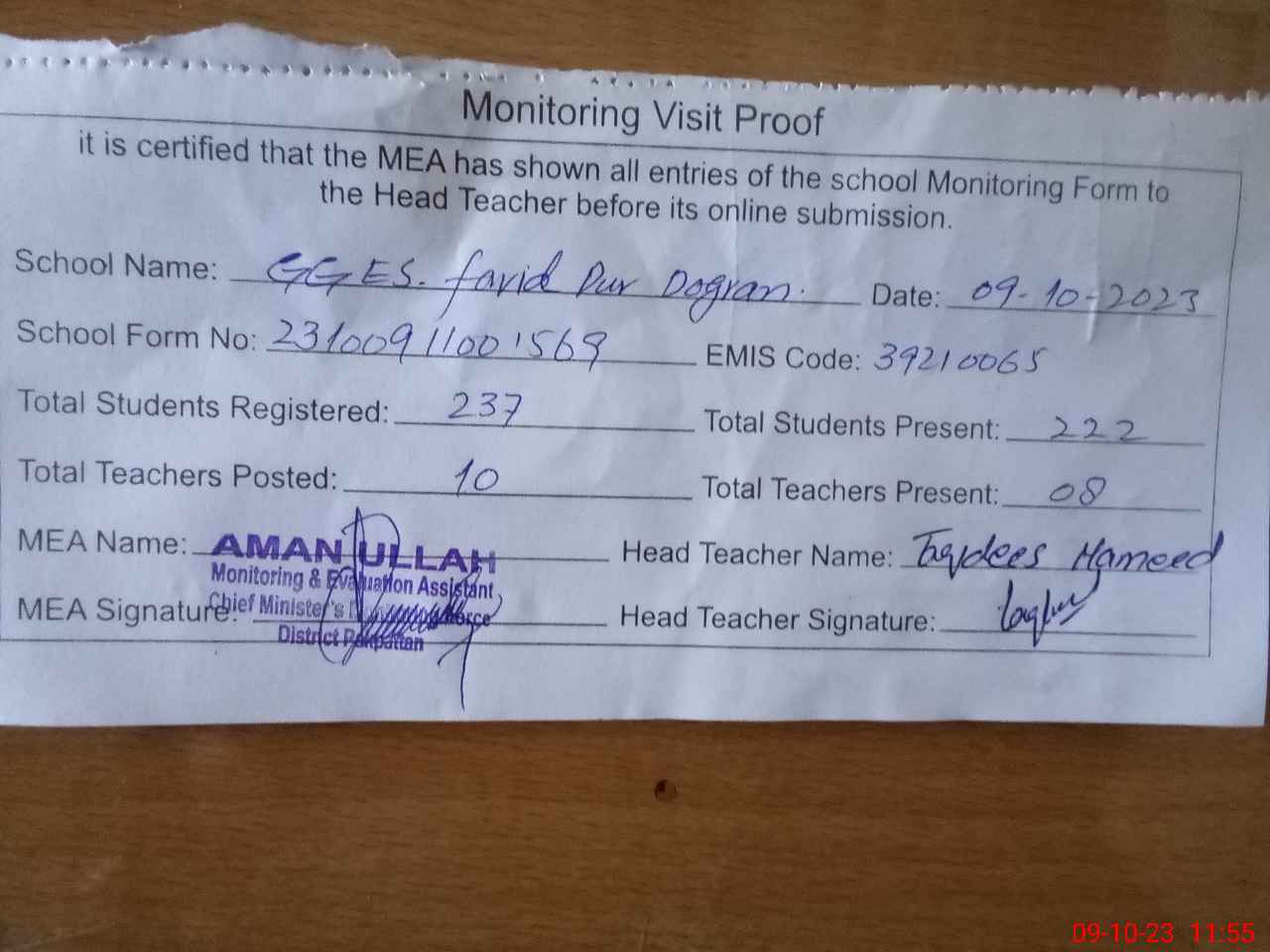 | Attendance Register | Head Teacher | MEA with School | Visit Proof |
