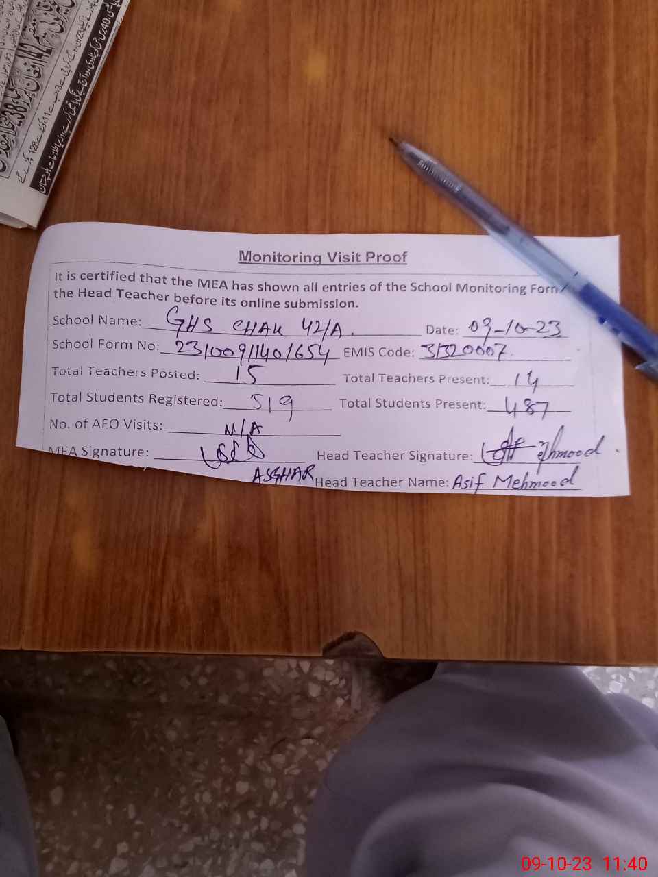 | Attendance Register | Head Teacher | MEA with School | Visit Proof |