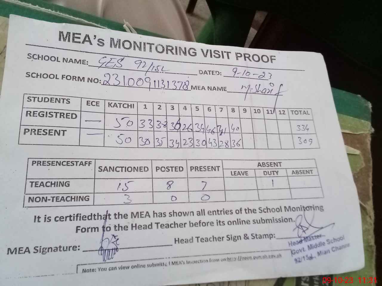 | EMIS Code: 36430064 | Name of School: GES 92/15-L, MIAN CHANNU | |||