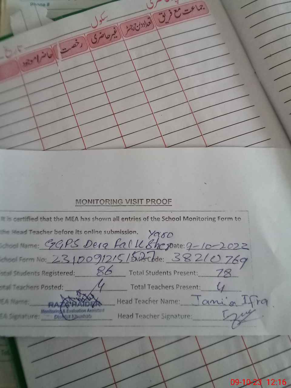 | Attendance Register | Head Teacher | MEA with School | Visit Proof |