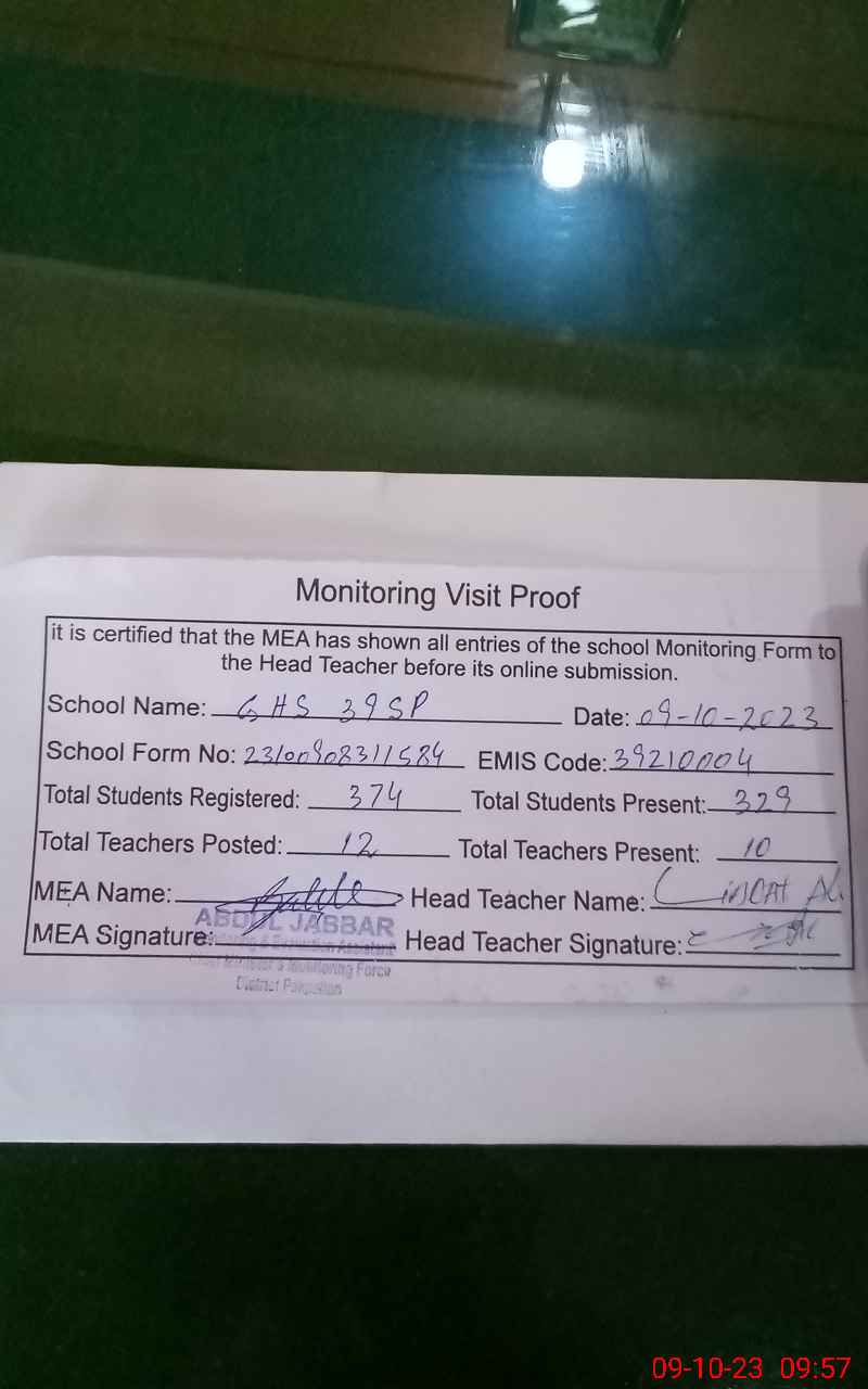 | EMIS Code: 39210004 | Name of School: GHS 39/S.P | |||