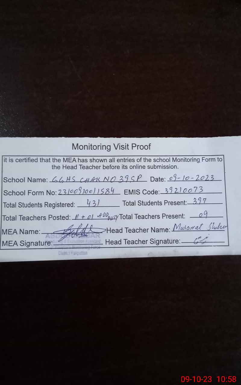 | EMIS Code: 39210073 | Name of School: GGHS CHAK NO.39 SP | |||