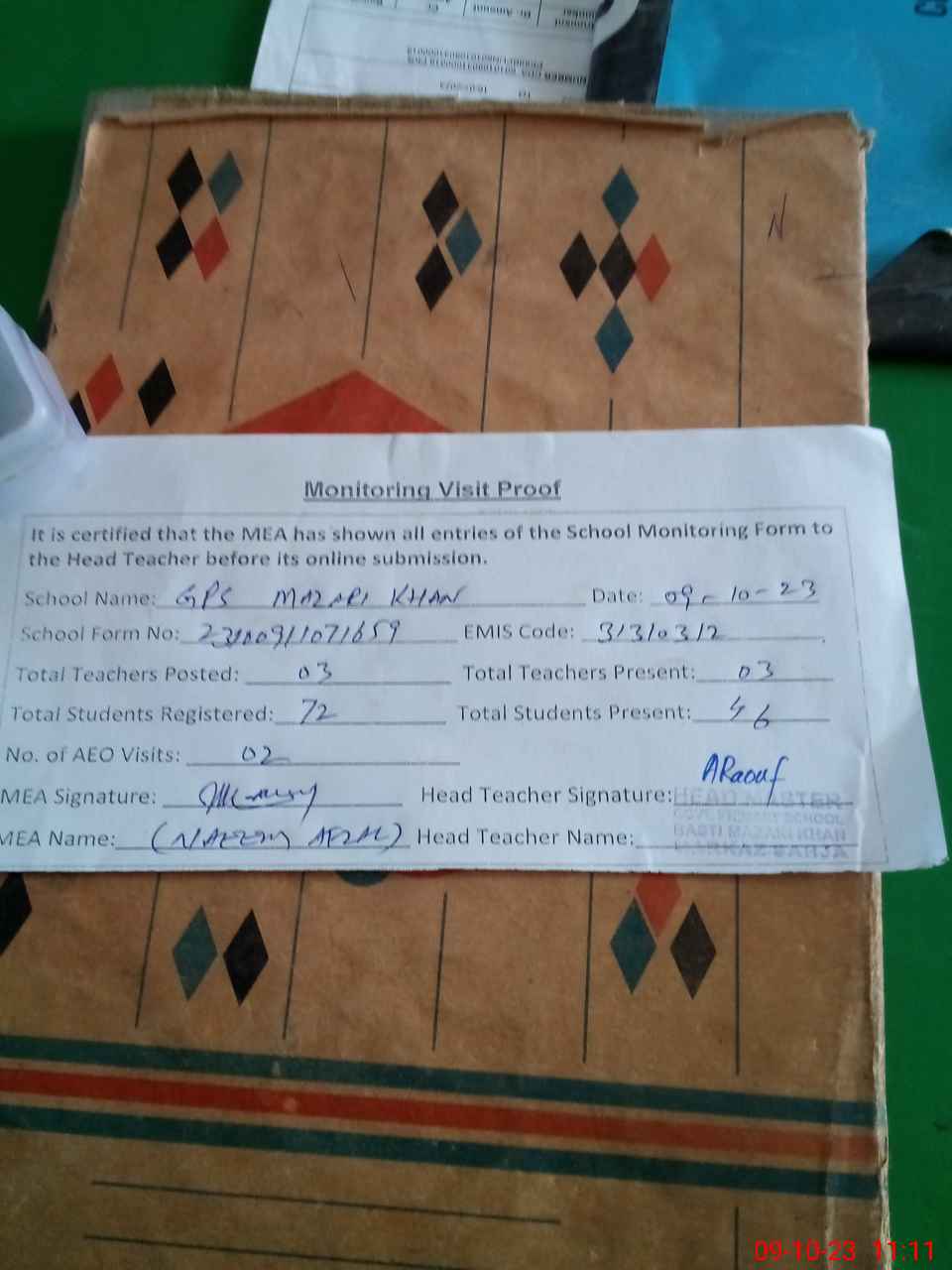 | EMIS Code: 31310312 | Name of School: GPS MAZARI KHAN | |||