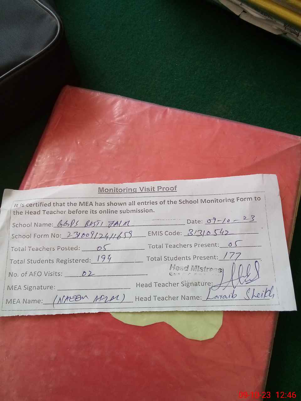 | Attendance Register | Head Teacher | MEA with School | Visit Proof |