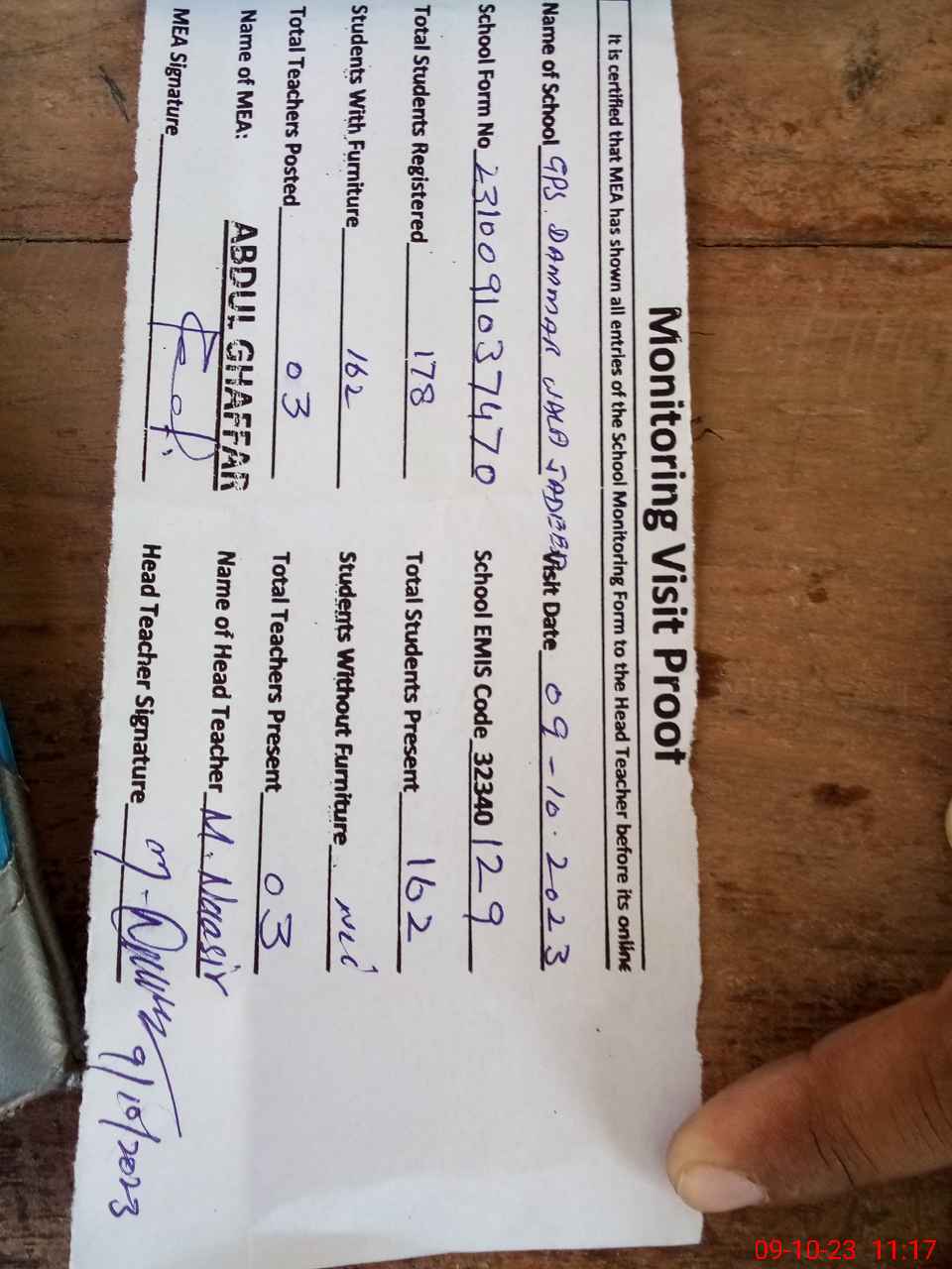 | Attendance Register | Head Teacher | MEA with School | Visit Proof |