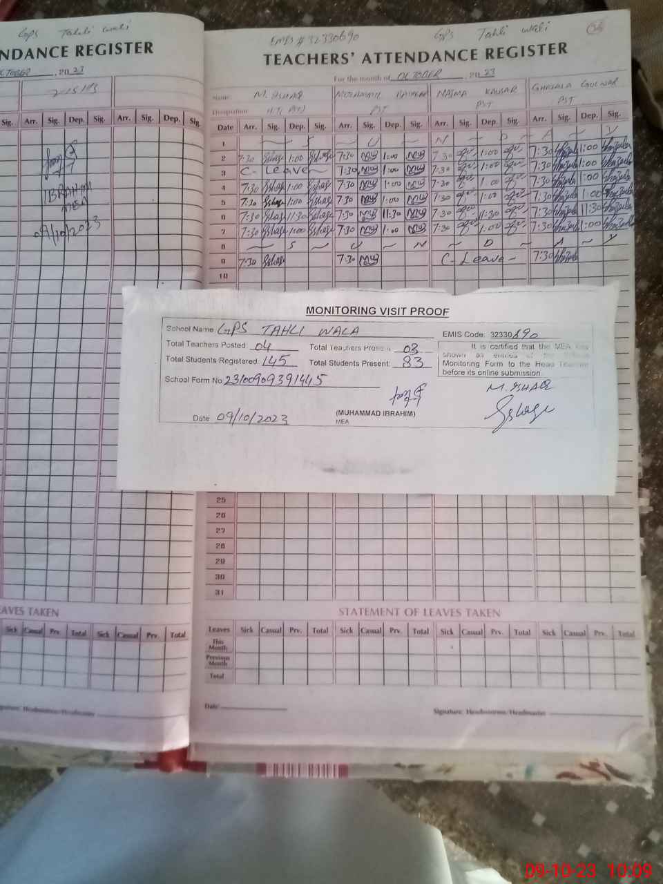 | Attendance Register | Head Teacher | MEA with School | Visit Proof |