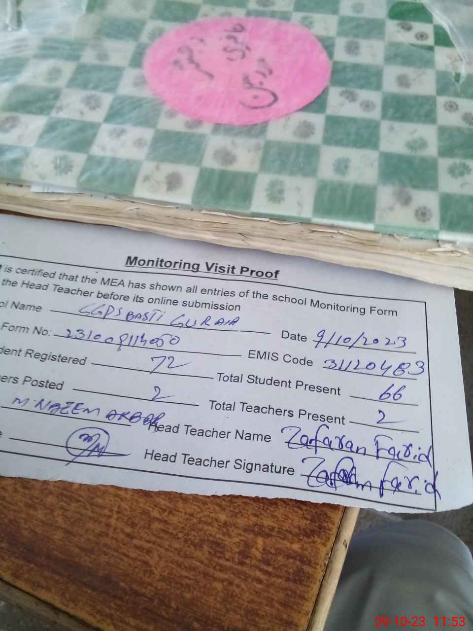 | Attendance Register | Head Teacher | MEA with School | Visit Proof |