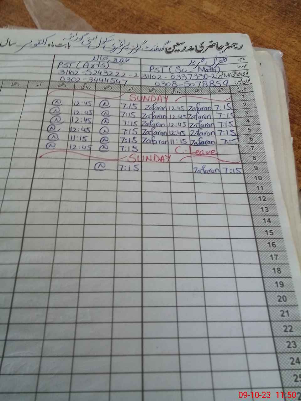 | CNIC | Full Name | Designation | R/C | Absence During Last Calender Month |