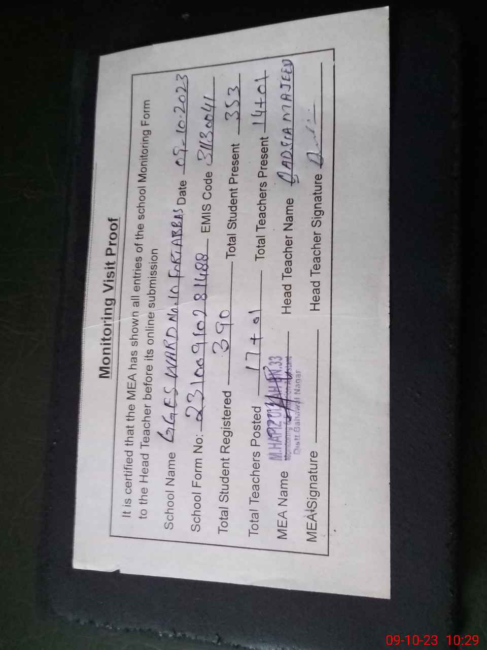 | Certified that this School was Inspected by the Undersigned MEA/DMO Today and the Information Stated Above is as Per Record. | |||||