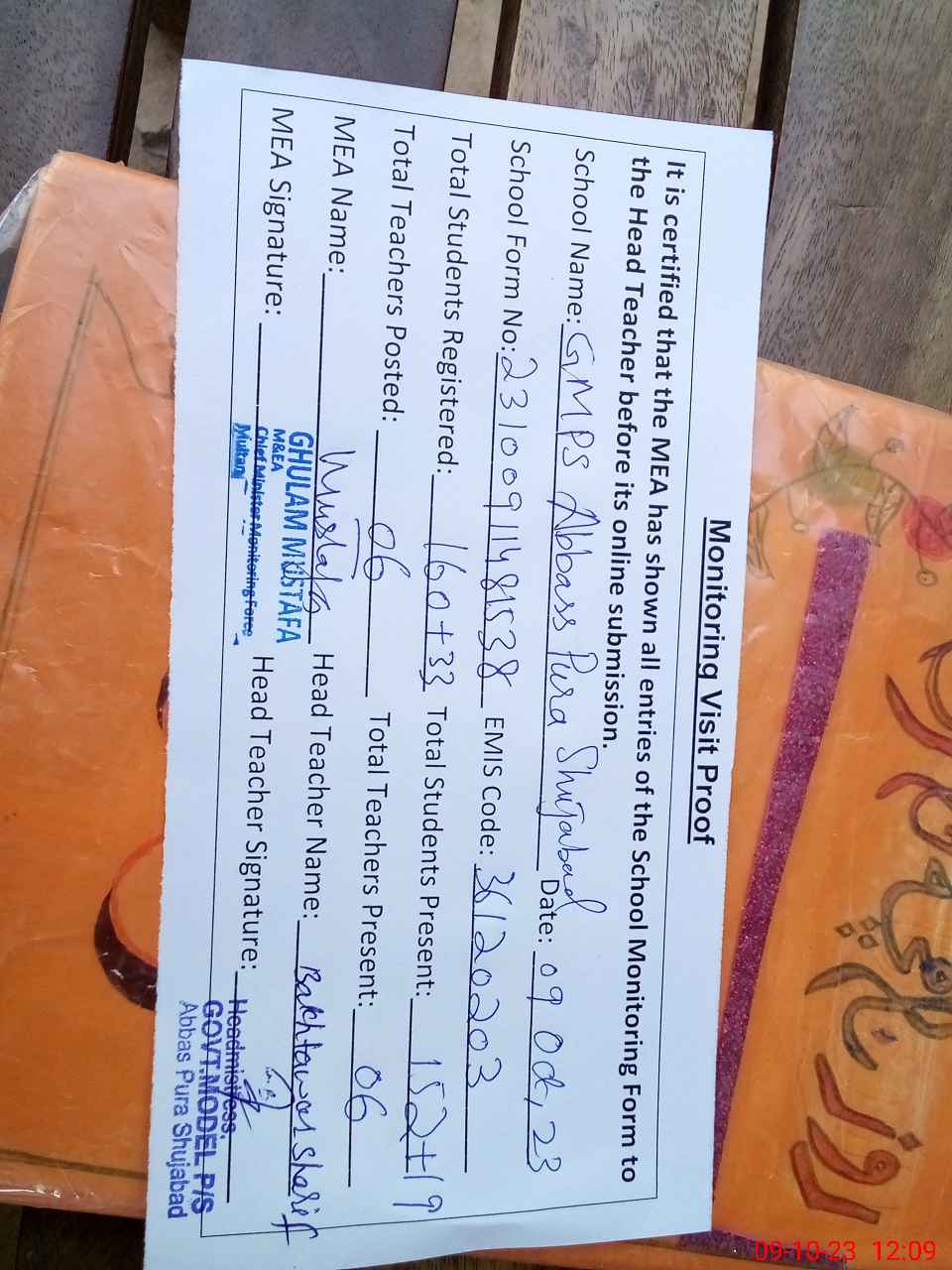 | Attendance Register | Head Teacher | MEA with School | Visit Proof |