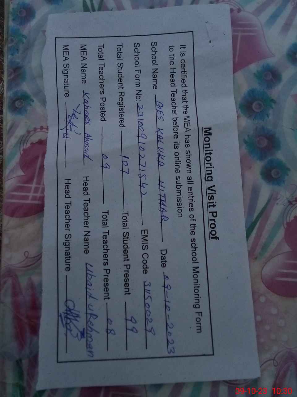 | Certified that this School was Inspected by the Undersigned MEA/DMO Today and the Information Stated Above is as Per Record. | |||||