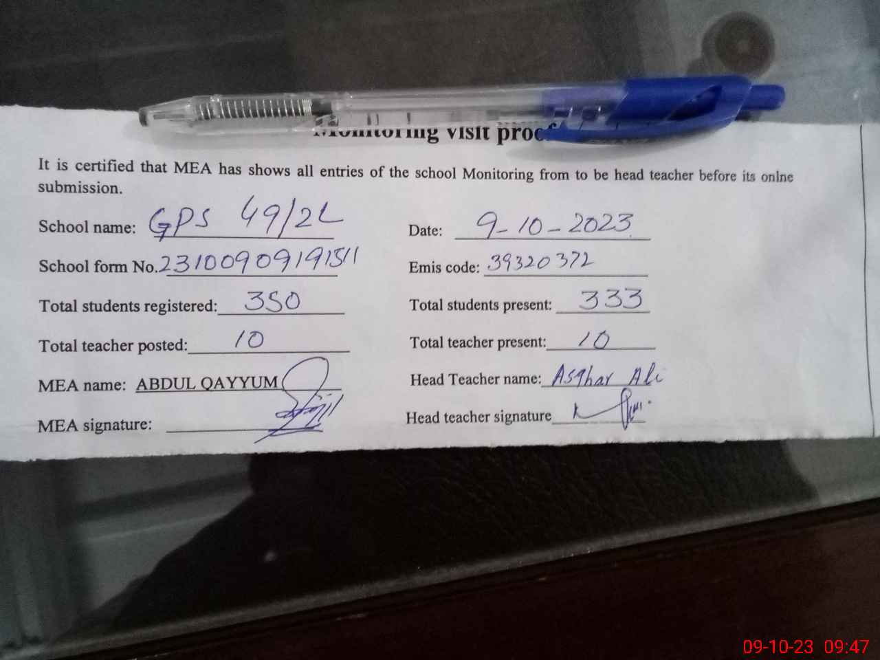 | Monitoring Date: 09-10-2023 | Start Time: 09-10-2023 09:11 AM | End Time: 09-10-2023 09:50 AM | Name of MEA: AB**** QA**** | |